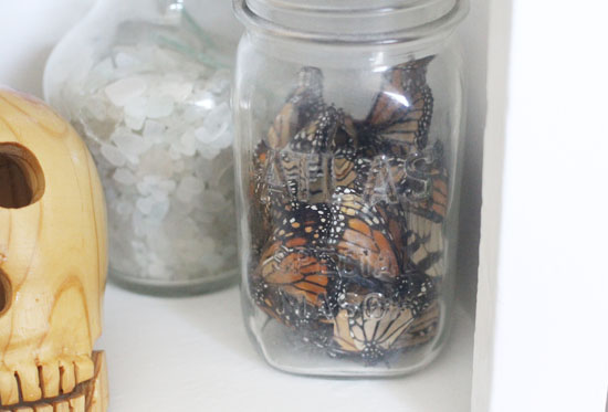 Wow I love how this is all displayed, quite odd but beautiful in itself. I love the jar of butterflies! <3