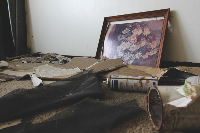 Last week Jeff, Brandon, and I met up early in the morning to do some exploring. I had scoped out a few abandoned buildings while cruising around the East side of Cleveland, things I wouldn’t necessarily snoop around by myself. That day we made our way into and around three abandoned apartment buildings. The first was actually the tallest abandoned structure I’ve ever been in, 10 stories tall! We, of course, hiked up the stairs and to the roof first. The view was incredible but I was more interested in what might be inside. As it turned out, there wasn’t much at all. Most of the apartments had been completely cleaned out. A few had a handful of items left, and then there was one that formerly housed a hoarder. (I’m sure it won’t be hard for you to figure out which photos those are!) Anyway, here’s a mix of photos from all three buildings…