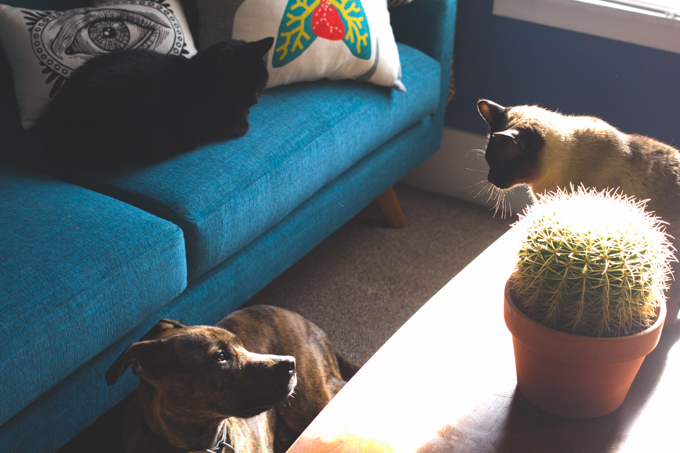 I also think the move brought the animals closer together. Klaus has wanted to be friends with both cats since day one but they’ve always wanted nothing do with him. In the past few months Professor has been warming up to him, and even laying in bed at the same time as him – never touching, of course. But Squid, she’s always kept her distance. If he’s even in her sight, she’s gone. This last week though? They’ve been hanging out a lot more. They were even caught laying on the same rug enjoying a ray of sun together. Slowly but surely they’re all getting more and more comfortable. I’m overjoyed! Above is the very first picture I have ever taken of the three of them together.