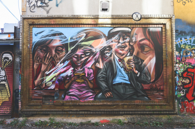 Back in March Jeff and I made in brief stop in Baltimore to have dinner with a friend since we were passing through. While wasting time we stumbled upon their graffiti alley (see my post here!) and I was super impressed. It was a legal spot where artist could paint! That’s really awesome but Toronto’s graffiti alley and that place are on totally different levels. The fact I thought that was soo awesome was almost laughable after visiting Toronto. There is so much to see here, and I’m gonna say it fifty more times in this post – the caliber of artistry in these pieces is insane. I guess you could say Toronto has an outdoor art museum. The piece below even has a stinken frame around it! How awesome is that!?