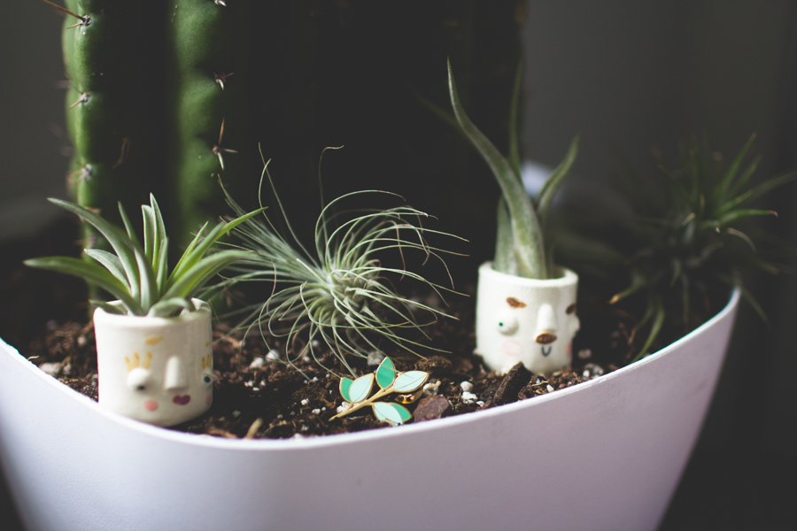 Tiny face planters by Friend Assembly, eucalyptus pin by Hemleva, and air plants from Aura Creations.