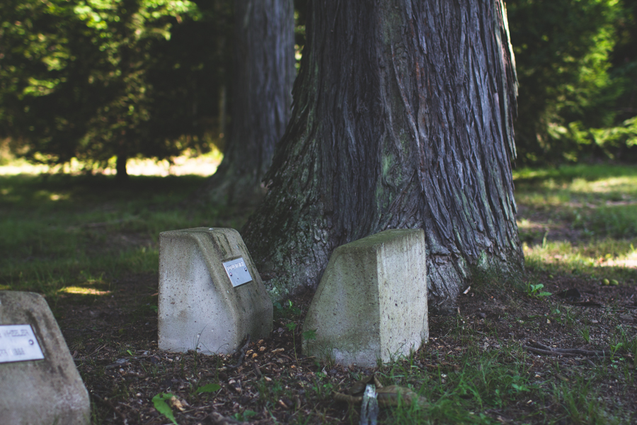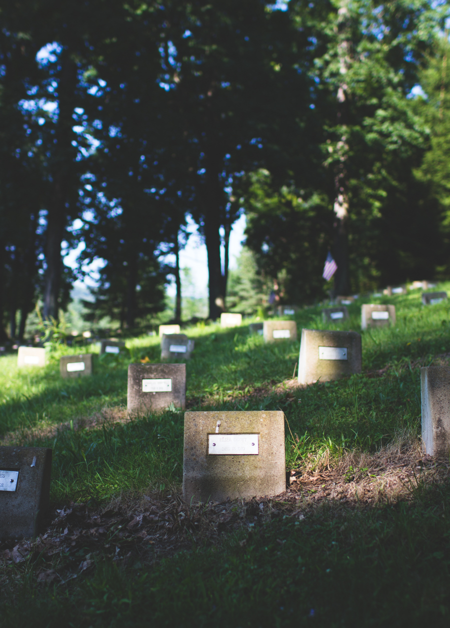 211 : 365 On our way home from camping we made a little detour to visit a state hospital. Jeff really enjoys the architecture of this certain type of hospital, I had wanted to check out a psychiatric hosptial cemetery for a while now, and there was a geocache on the hospital grounds so it was really a win/win/win. I didn’t take many photos since basically all of the headstones were the same but I did take a handful of shots essentially just to say “I was here.” With the spotty lighting I wasn’t sure I’d have anything worth sharing but I did end up loving the photo below. My favorite part has to be that ghostly looking thing near the center of the photo between the tree and the flag. Eeeep!