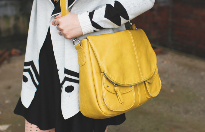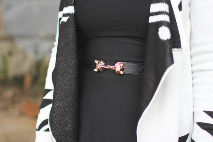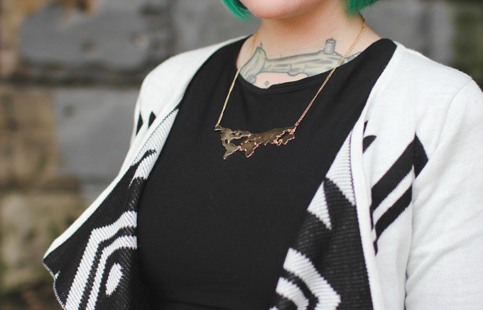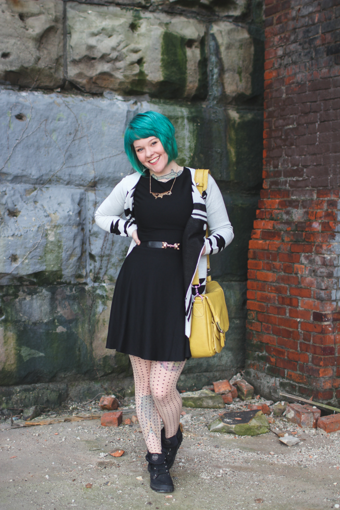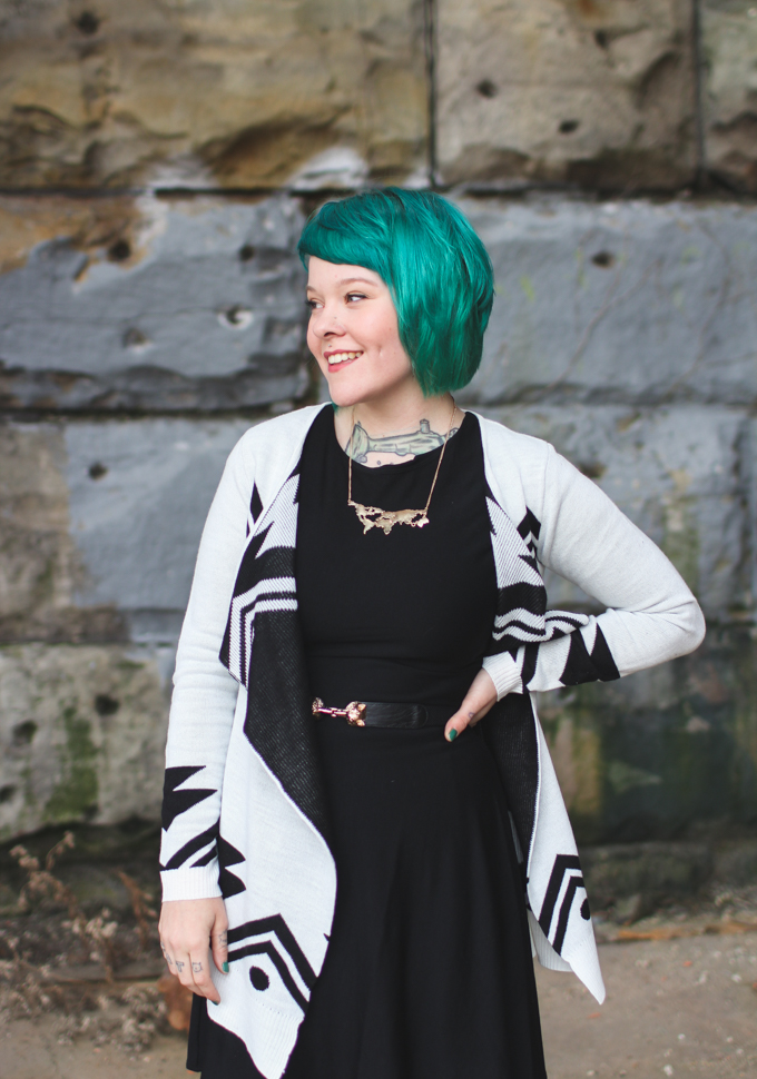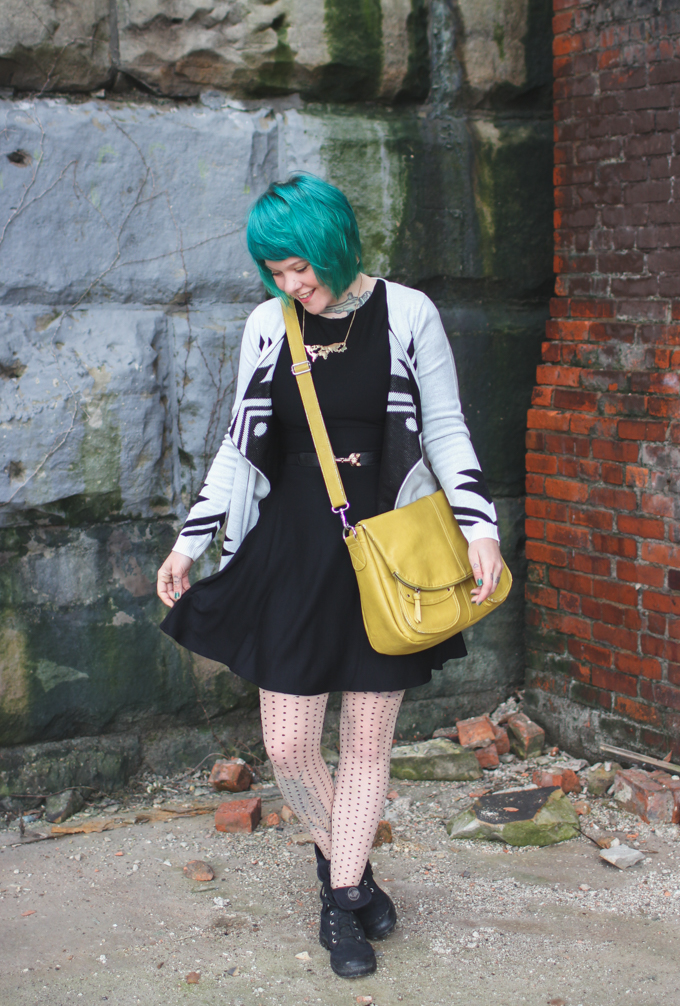 I love a good black and white outfit too. This black dress looks amazing on you and I really like the cozy cardigan and dotted tights paired with it. Your map necklace is so cool too!