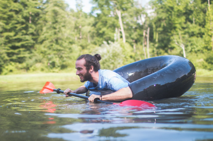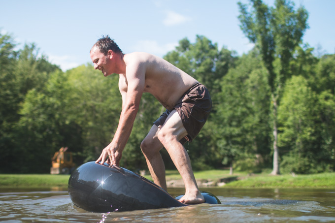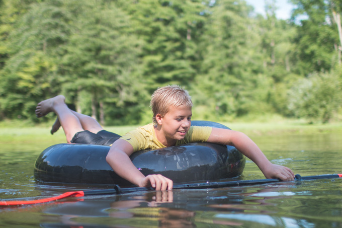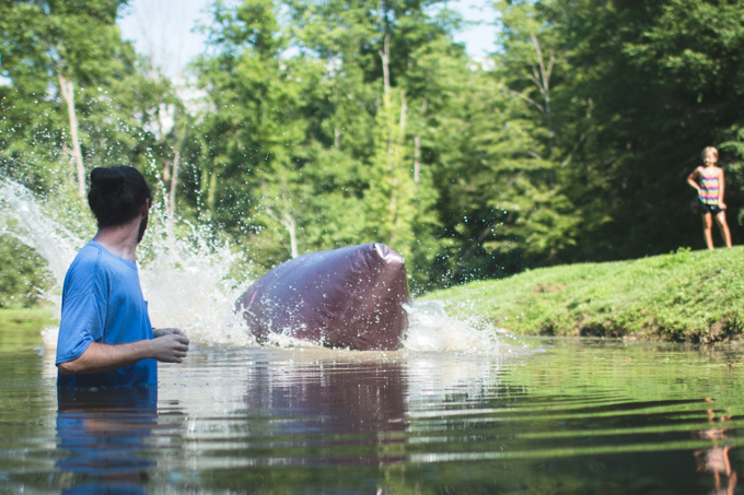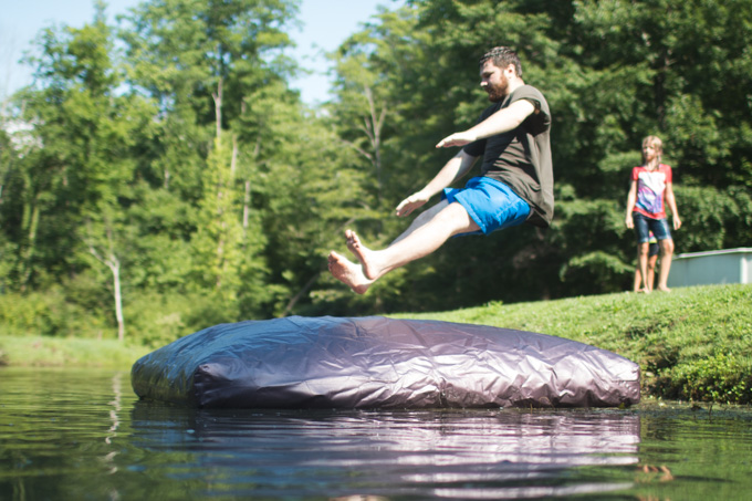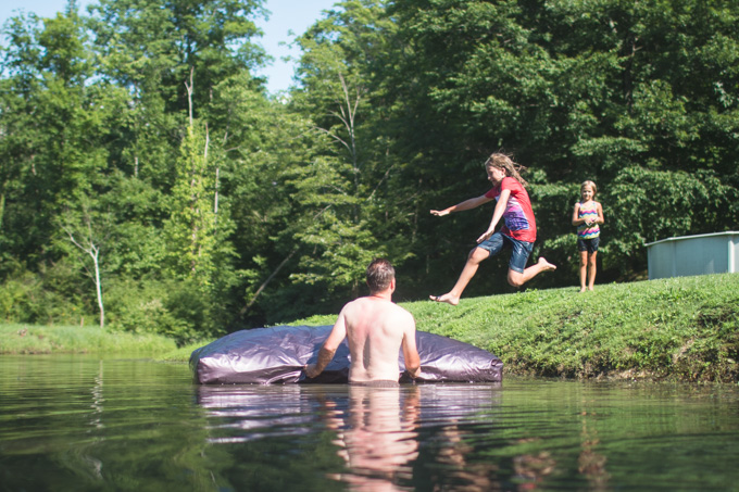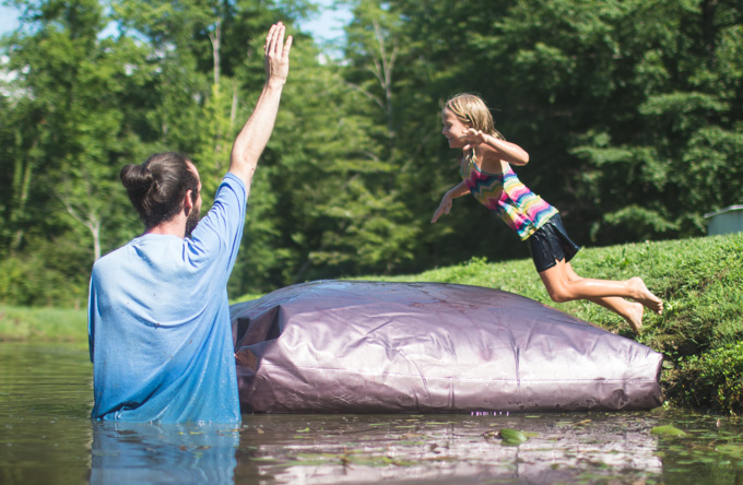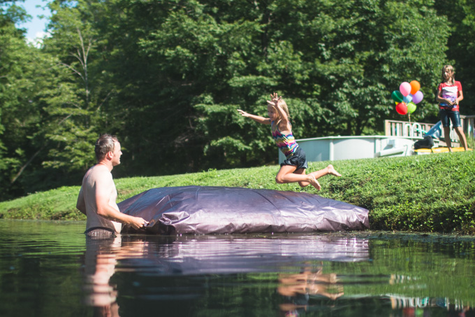 The rain stopped very shortly after we started sliding so the hill dried up pretty quickly. We weren’t able to slide as far anymore. After a few failed attempts at prolonging the fun with the hose and buckets of water from the pond, I gave up. Then “I’m just going in to rinse off in the pond” turned into spending a couple of hours floating around and taking turns jumping onto a mattress my dad blew up for the occasion.