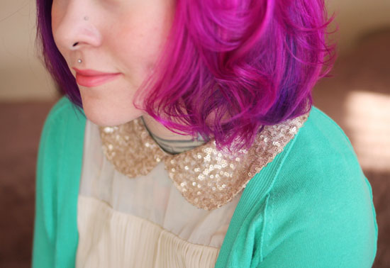Your shirt-collar-cardigan mix are so pretty together. Also, would you try a red color for your hair? A nice mix (kind of) between blue and purple. (Actually, that might be green. xD)