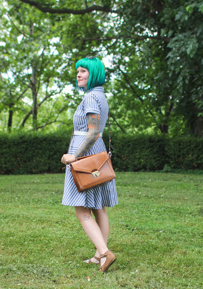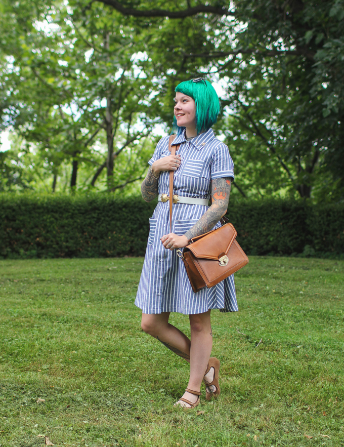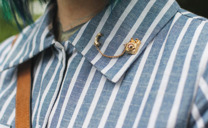 I love outfit posts- they usually always are some of my favorites! That dress is so cute- the different directions of stripes is a fantastic detail! Your telephone brooch is wonderful as well! Aren't garage sales the greatest?