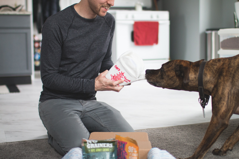 Klaus getting a whole box of things was the absolute cutest! He would take a toy, run over to the other side of the living room, set it down, and run back to see what else we had for him. The box he received was New York City themed. Actually “Poo York City!” I really enjoyed all the silly plays on words found in the box. “Pawsonalize.” “Guaranpeed.” “Barkefeller Center.” So cute! He’s not picky about treats so it was no surprise that he loved those (As seen in one of the photos above, Professor was also very interested in the bag of treats. A few days later he would rip open the bag and try to steal them.) The toys were a huge hit too. I’ve mentioned in the past how much Klaus loves squeaky toys so I was stoked to find that both of the toys in his box had squeakers.
