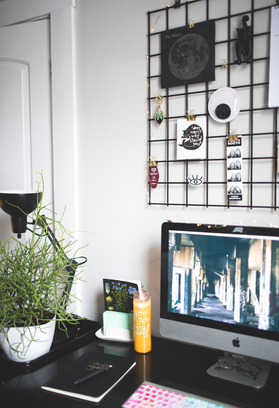 A couple days into 2018 I got the itch to start scooting furniture and ended up switching which wall my desk was on. Out of the four other places I’ve had my desk in this tiny room in the last year, this is the one that makes the most sense. It stops the sunshine from attacking my face every single day around noon (I hated having to close the blinds to be able to see my computer!) It gives me the largest wall to display plants, my shelf of favorite things, and large prints. Perhaps best of all, with my desk placed against the shortest wall in the room, I feel like I have a cozy little nook to work in. I’ll probably end up moving my desk another handful of times before moving out of this apartment but for now, this set up feels spectaular!